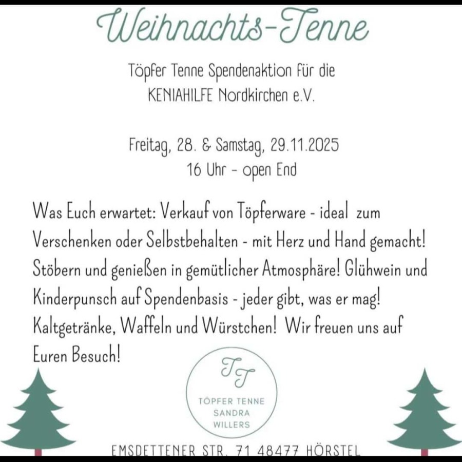 Die Töpfer-Tenne in Hörstel veranstaltet diese Aktion zugunsten der Keniahilfe Nordkirchen. Herzlichen Dank für die große Unterstützung!