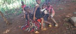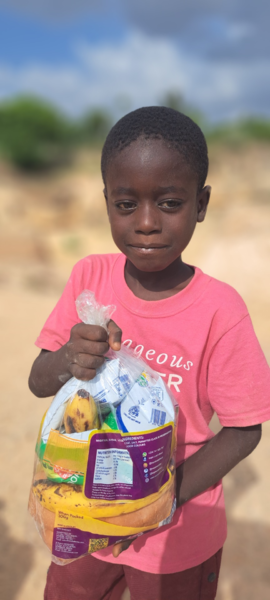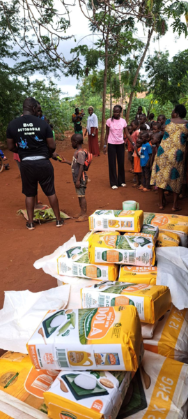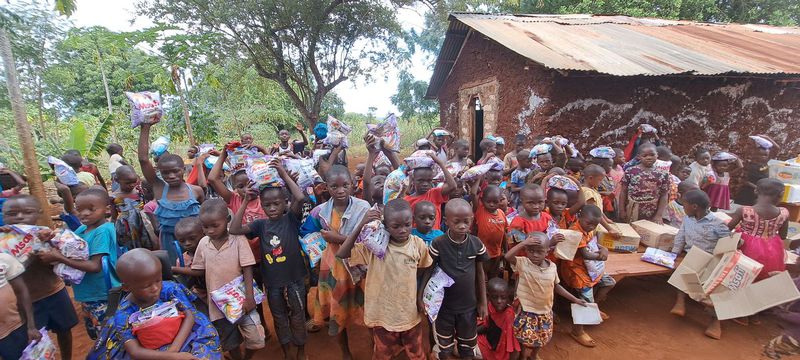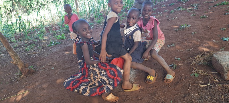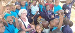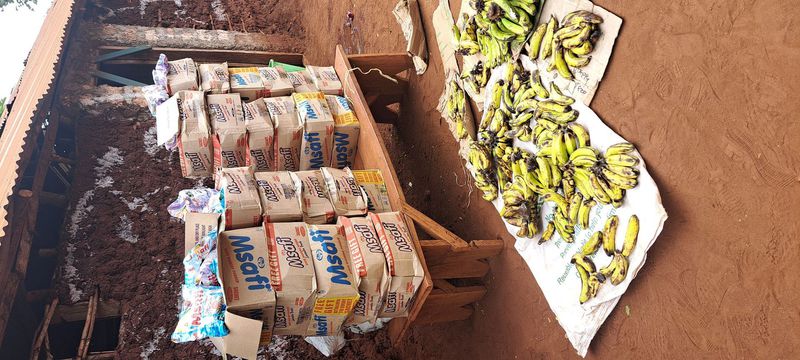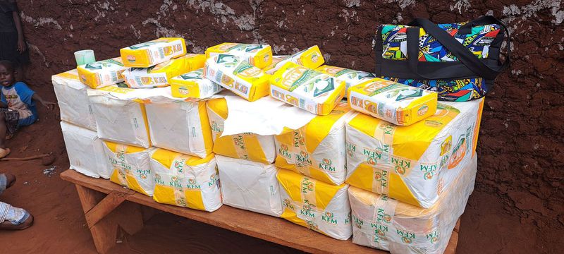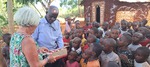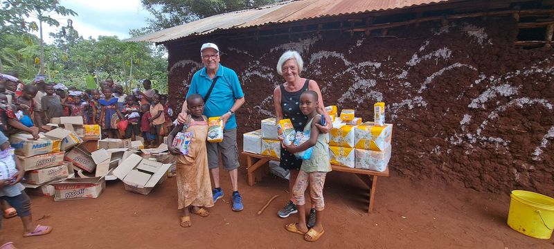 Schon um 9 Uhr waren wir mit Lilian erneut unterwegs. Bereits gestern hatten wir beschlossen, den vielen Kindern jeweils 2 kg Maismehl und zusätzlich Waschmittel und Seife zu schenken. Lilian hatte das dann alles organisiert, was gar nicht so einfach war. Die rund 200 kg Maismehl wurden direkt zum Zielort geliefert. Waschmittel/Seife und 200 Bananen haben wir in einem großen Van mitgenommen.